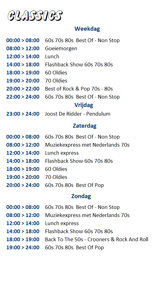 Te horen elke werkdag om 8-12-16 uur.